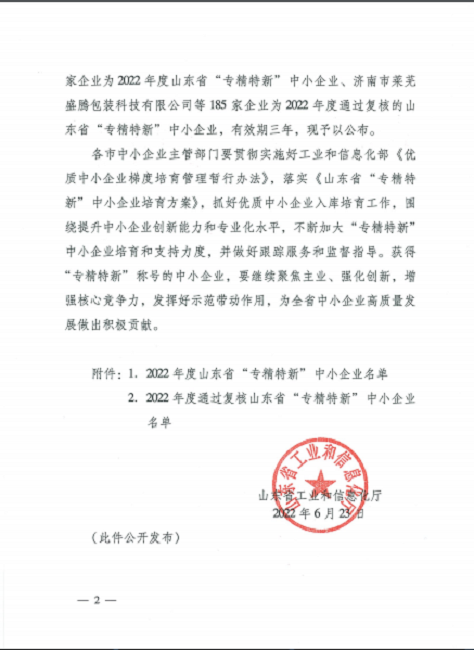 關(guān)于公布2022年度山東省“專精特新”中小企業(yè)的通知